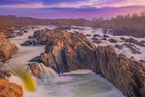 As the sun begins to rise, the sky is painted in soft purple hues, casting a dreamy glow over Great Falls. The rushing water reflects the gentle pastels, creating a perfect harmony between motion and stillness. Nature’s canvas comes alive, offering a tranquil start to a new day.