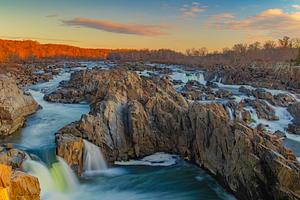Bathed in the warm glow of sunrise, the rugged cliffs and rushing waters of Great Falls come alive with vibrant hues. The golden light kisses the treetops, while the river carves its relentless path through the jagged rocks, creating a breathtaking dance of power and serenity. A perfect harmony of strength and beauty.